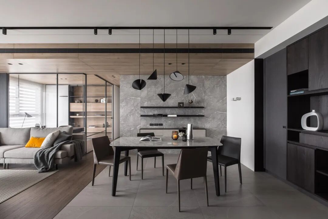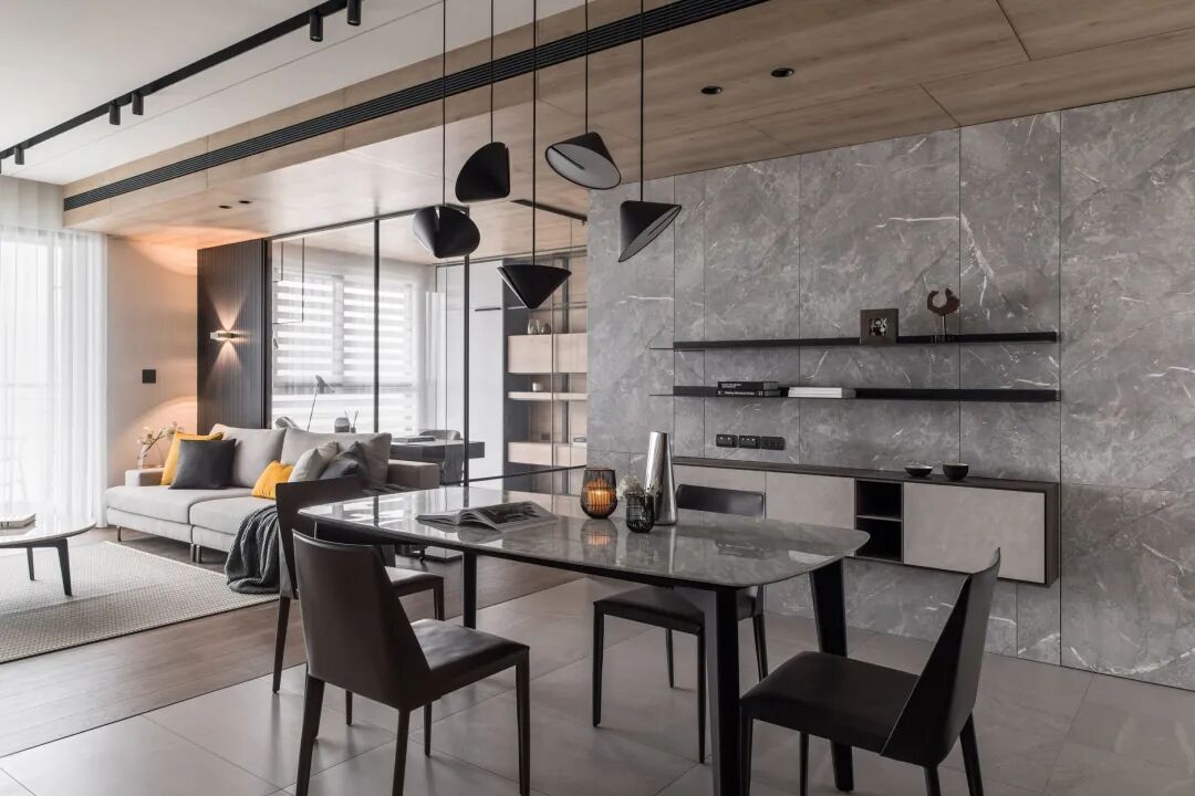 餐厅在灰色大理石背景墙的基础装上黑色的搁板,布置大理石材质台面的餐桌,让用餐氛围显得华丽而又优雅端庄。