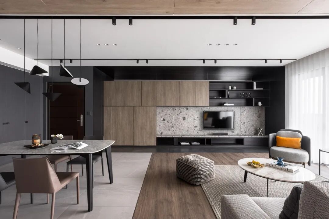 电视墙以水磨石为背景的基础,定制了黑色与深木色的电视柜,让客厅显得更加稳重而又端庄。