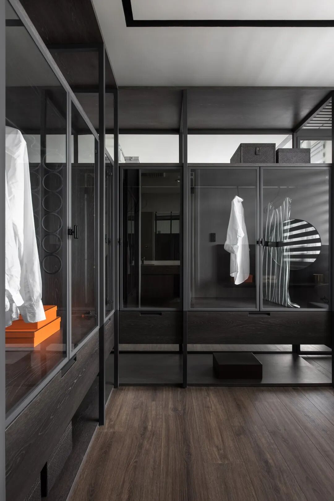 玻璃门+开放组合的衣帽架设计,也让衣物存放更加方便舒适。