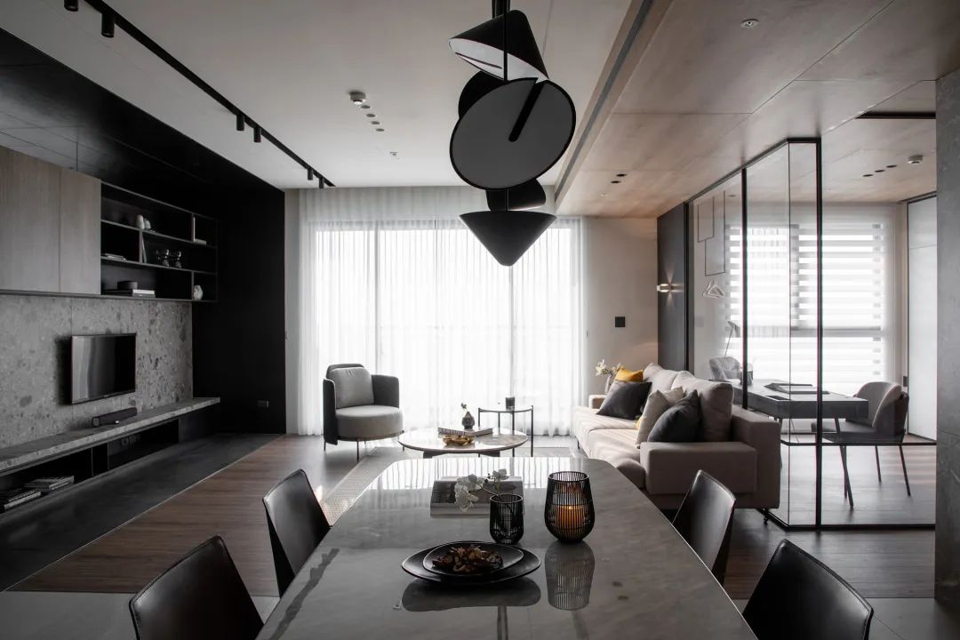 客厅、餐厅与书房空间通透的格局,以小资轻奢的暗色空间格局,呈现出一种现代稳重的端庄氛围。