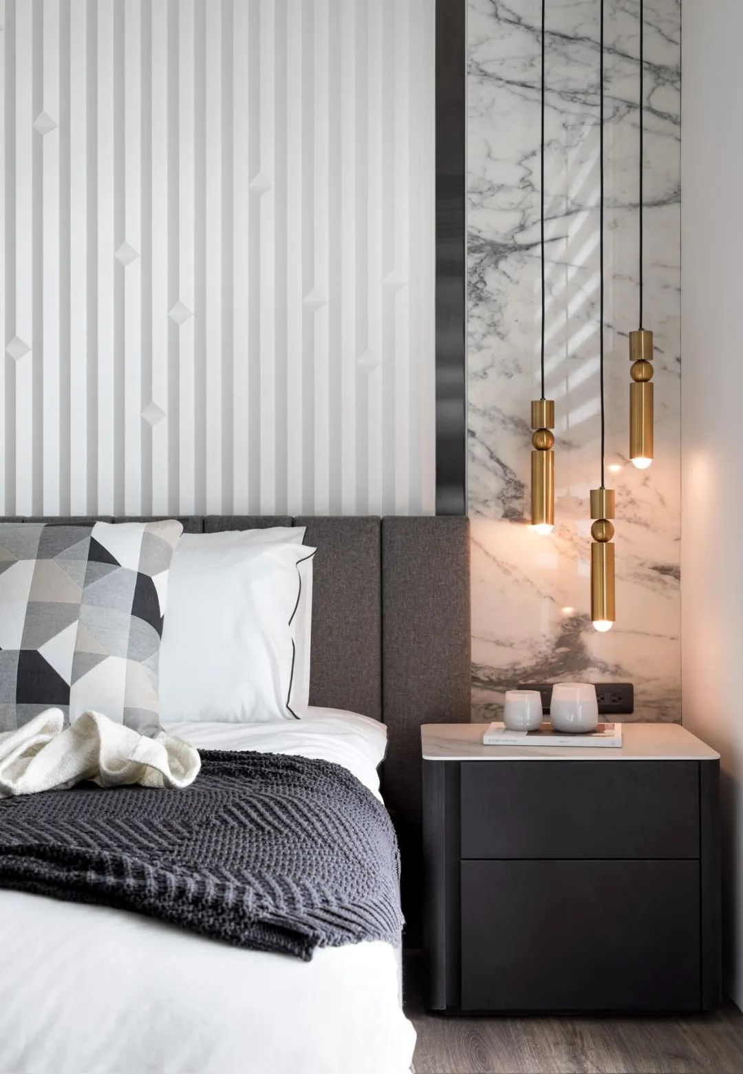 卧室床头墙以独特的白色凹凸造型,床头柜上方的轻奢金属质感吊灯,也让卧室显得更加优雅端庄。