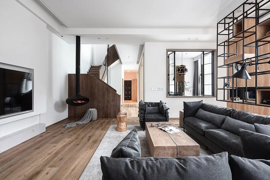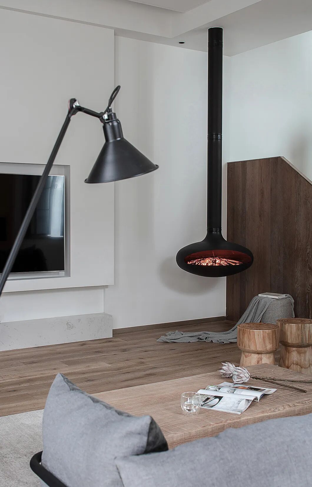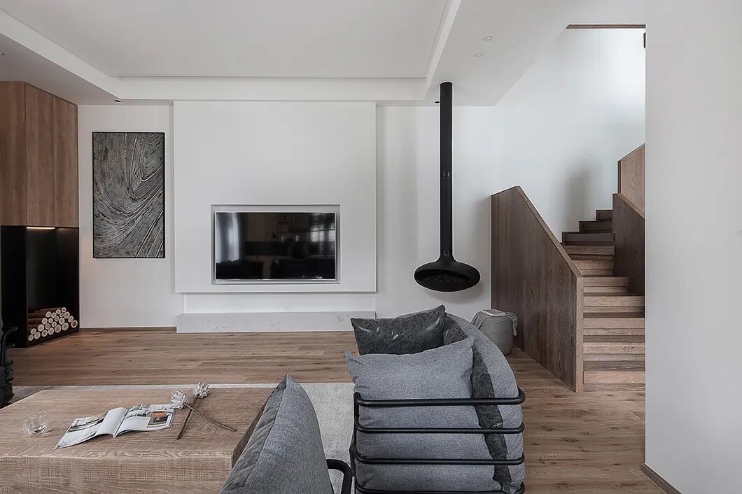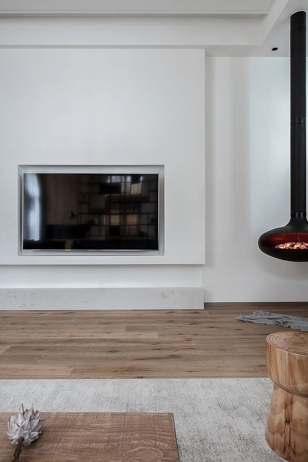 权衡客厅整体空间的氛围感,这里加入了碳钢悬吊壁炉,仿真火焰更注重环保。设计单品的点缀则以艺术的审美视角诠释高雅的生活情趣。