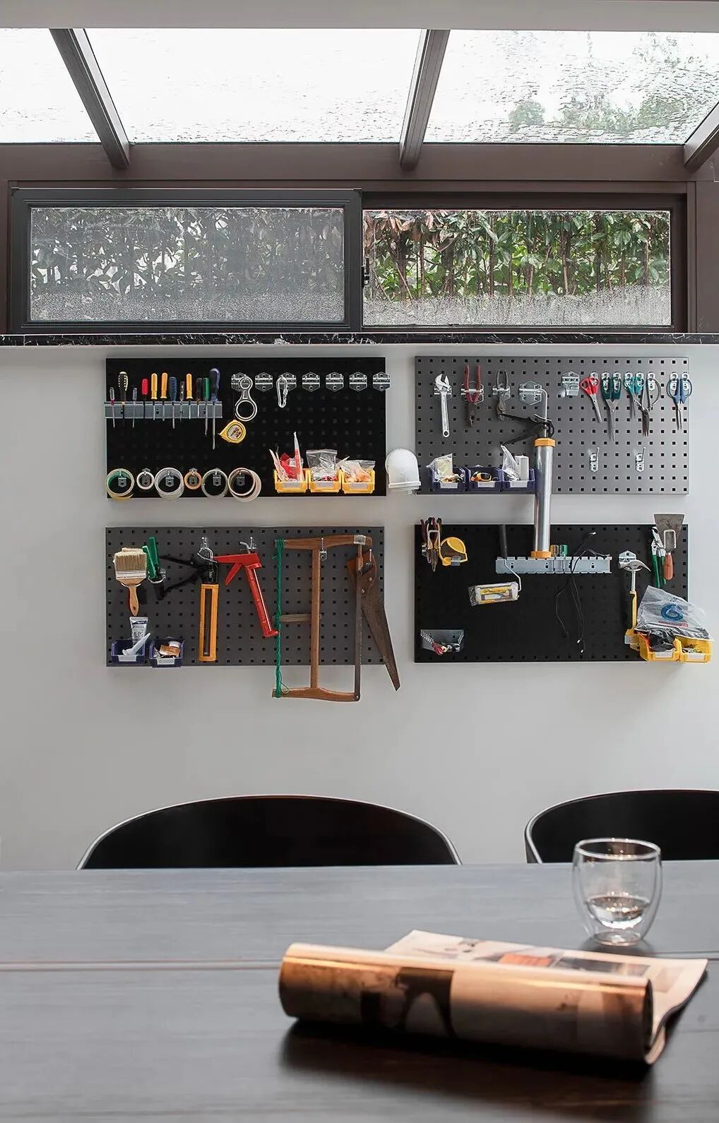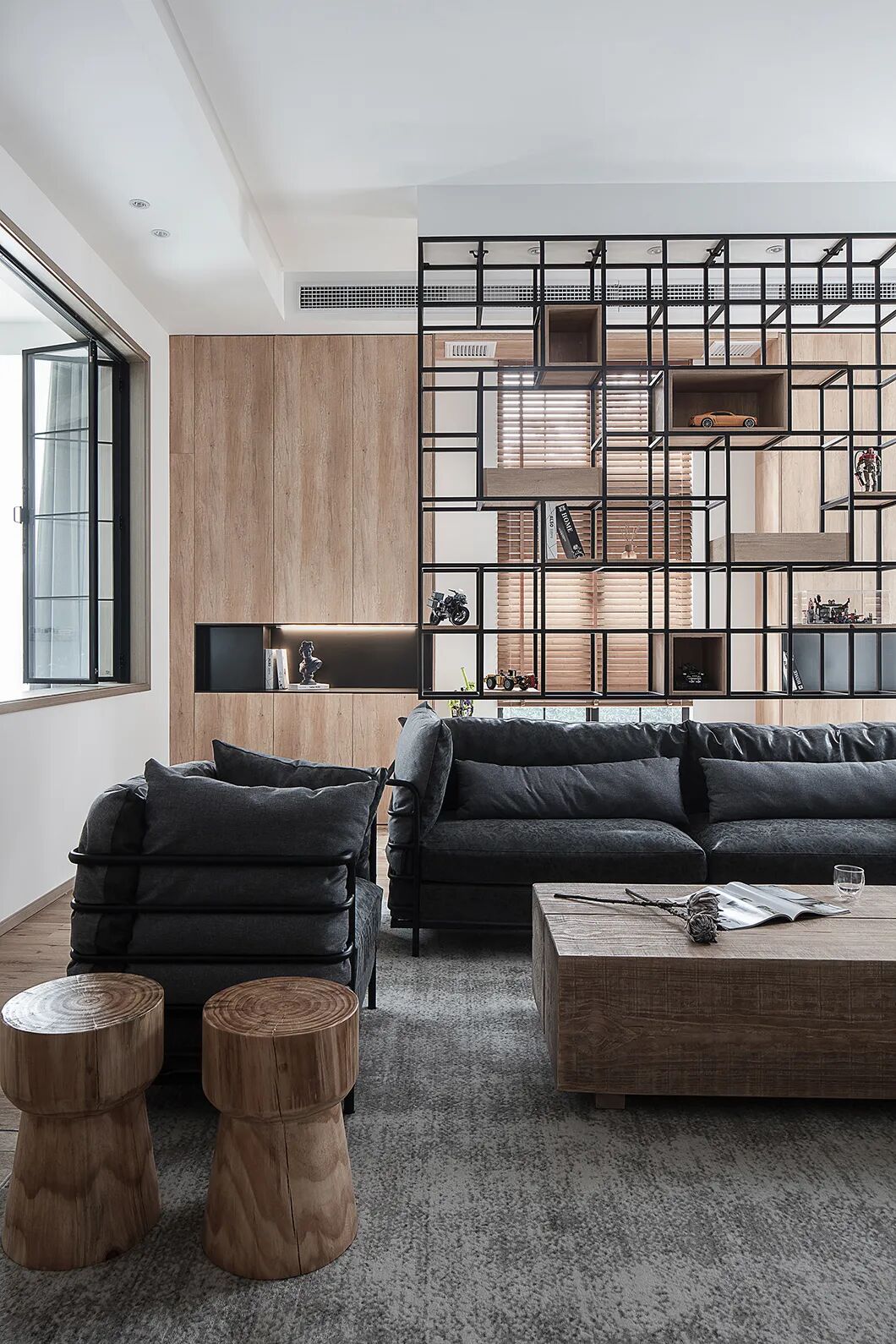 沙发背后高挑的铁艺置物架,在墙面分割出不同尺寸的几何轮廓,且镂空式设计降低了高度带来的压抑感,更显轻盈。