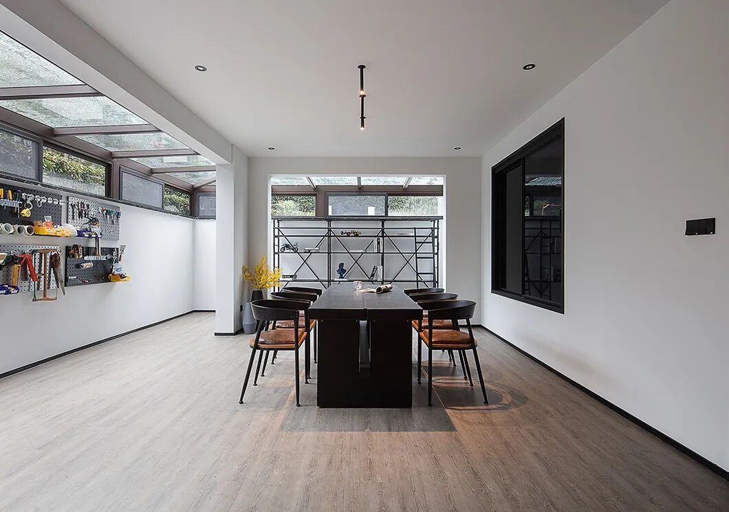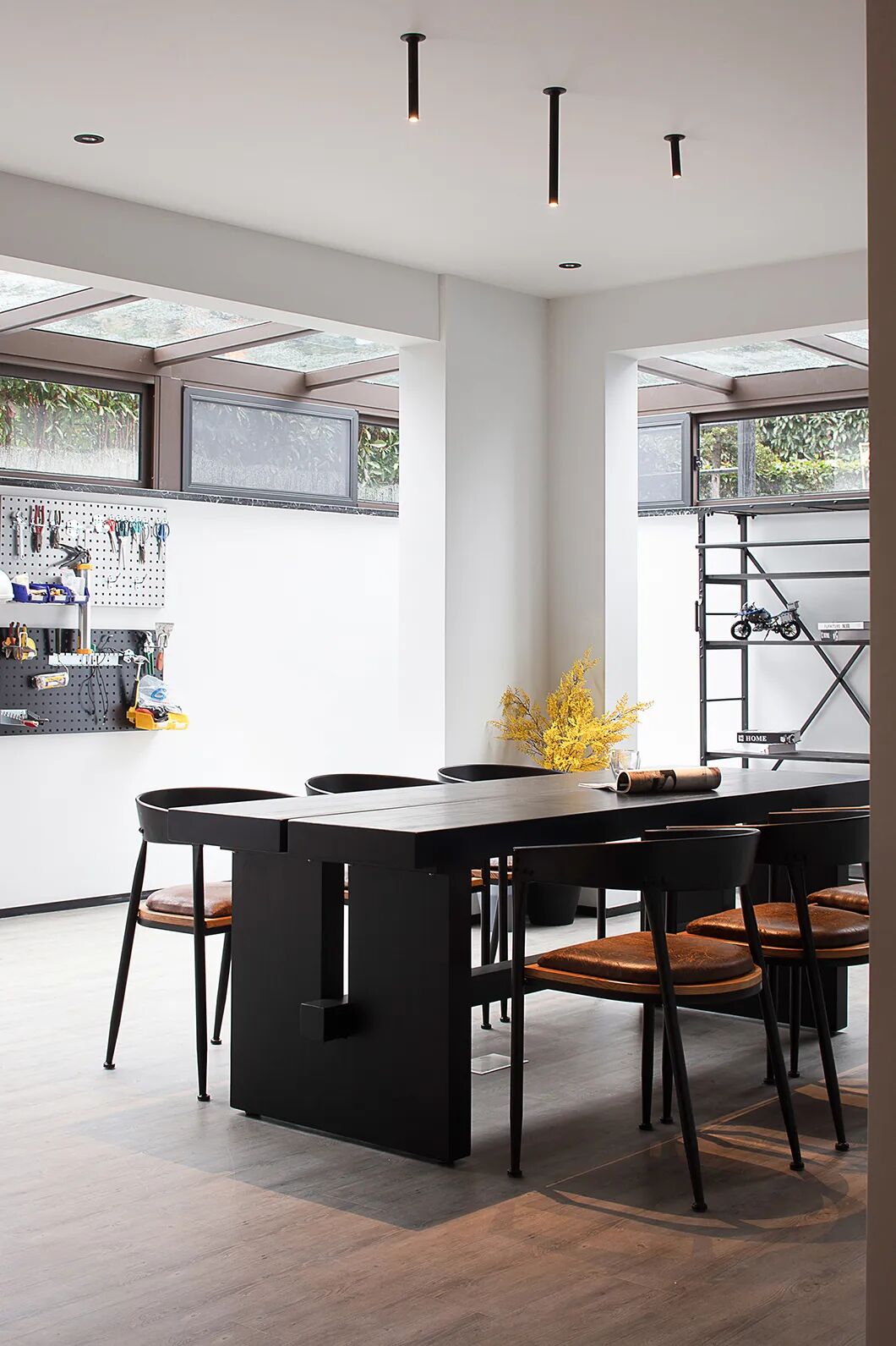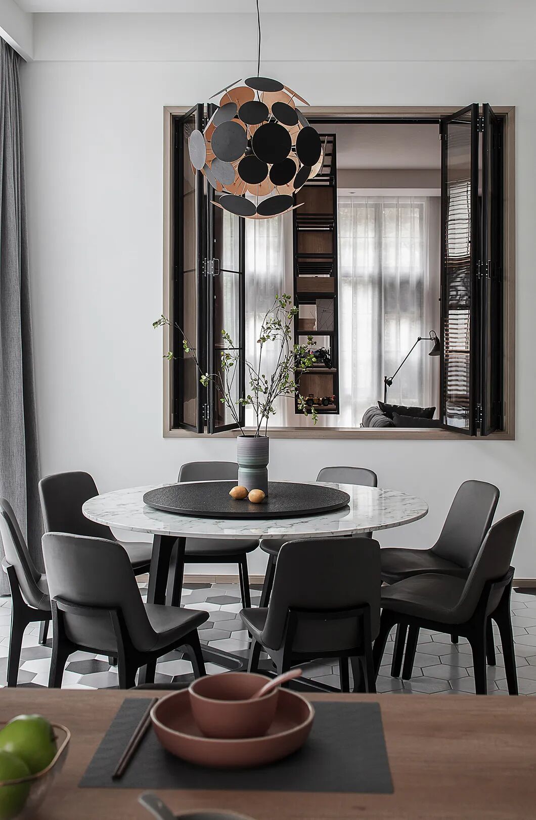 对于分区的界定,不再仅仅局限既定的格局性,更多的思考其动线的贯穿及空间趣味性的梳理,本套案例以通透的黑框玻璃让客餐厅保证独立的同时,也可以发生日常的联系……