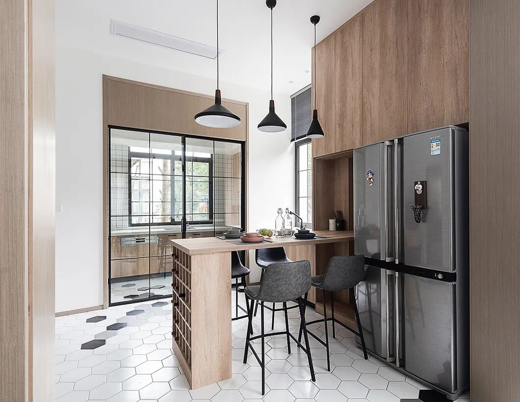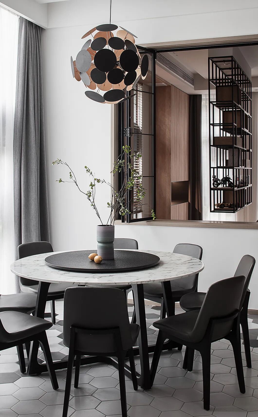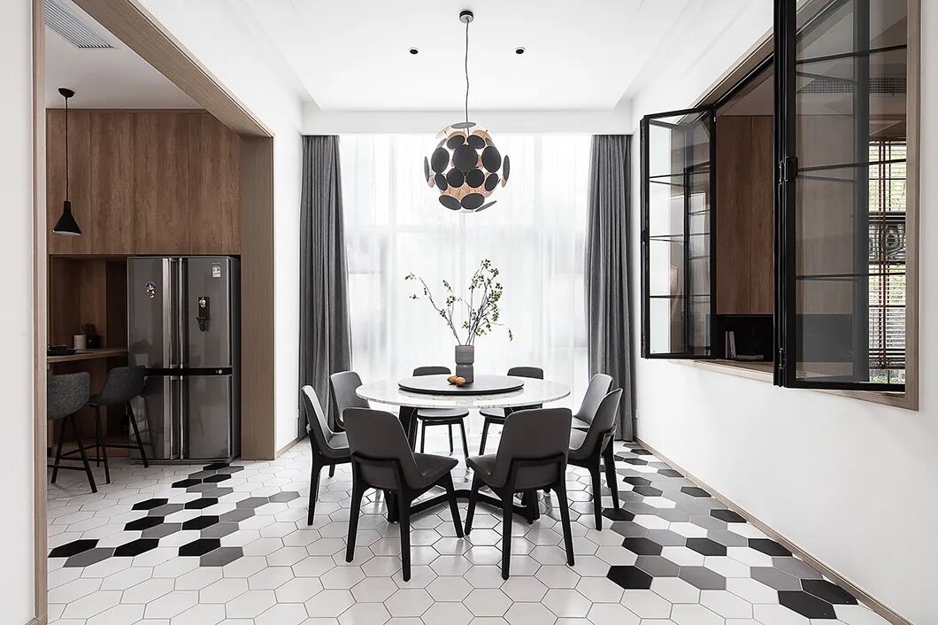 餐厅延续了整体的简约优雅,强调一种简练的高级感。圆形吊灯优雅垂落,将餐厅简约到了极致,与餐厅菱形地砖形成呼应,统一和谐,照亮一方天地。