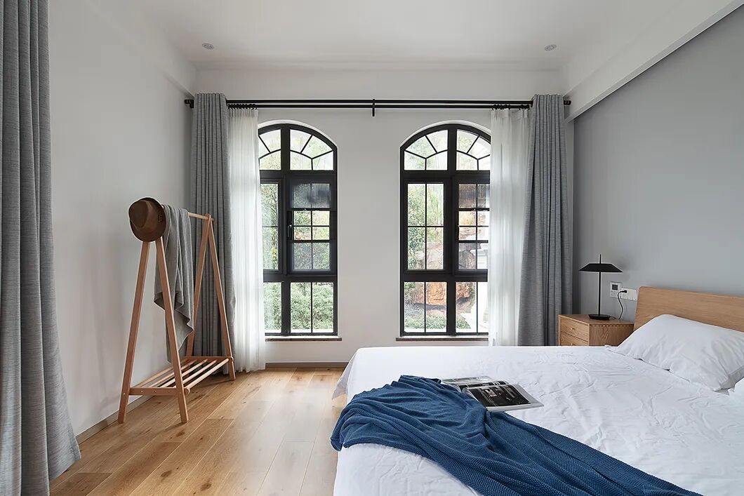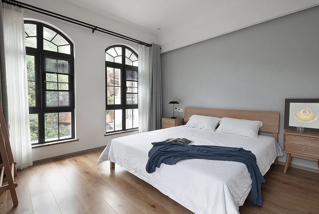 父母房延续了主基调,使得空间调性具有连贯感与简洁美。床靠背景墙以灰色打底,辅以原木色家具和白色床品,为房间注入温馨舒适的感觉。