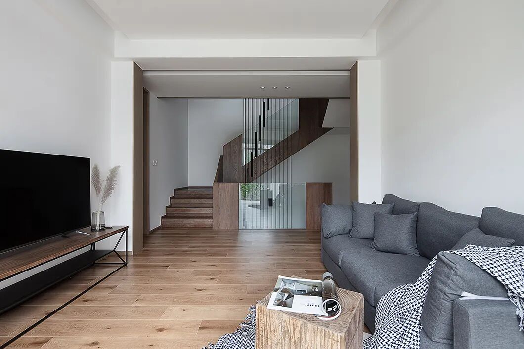 二楼起居室以简练的白墙,原木色的地板为底,搭配以灰色现代布艺沙发来点缀,简约中是柔和悠远的意蕴。