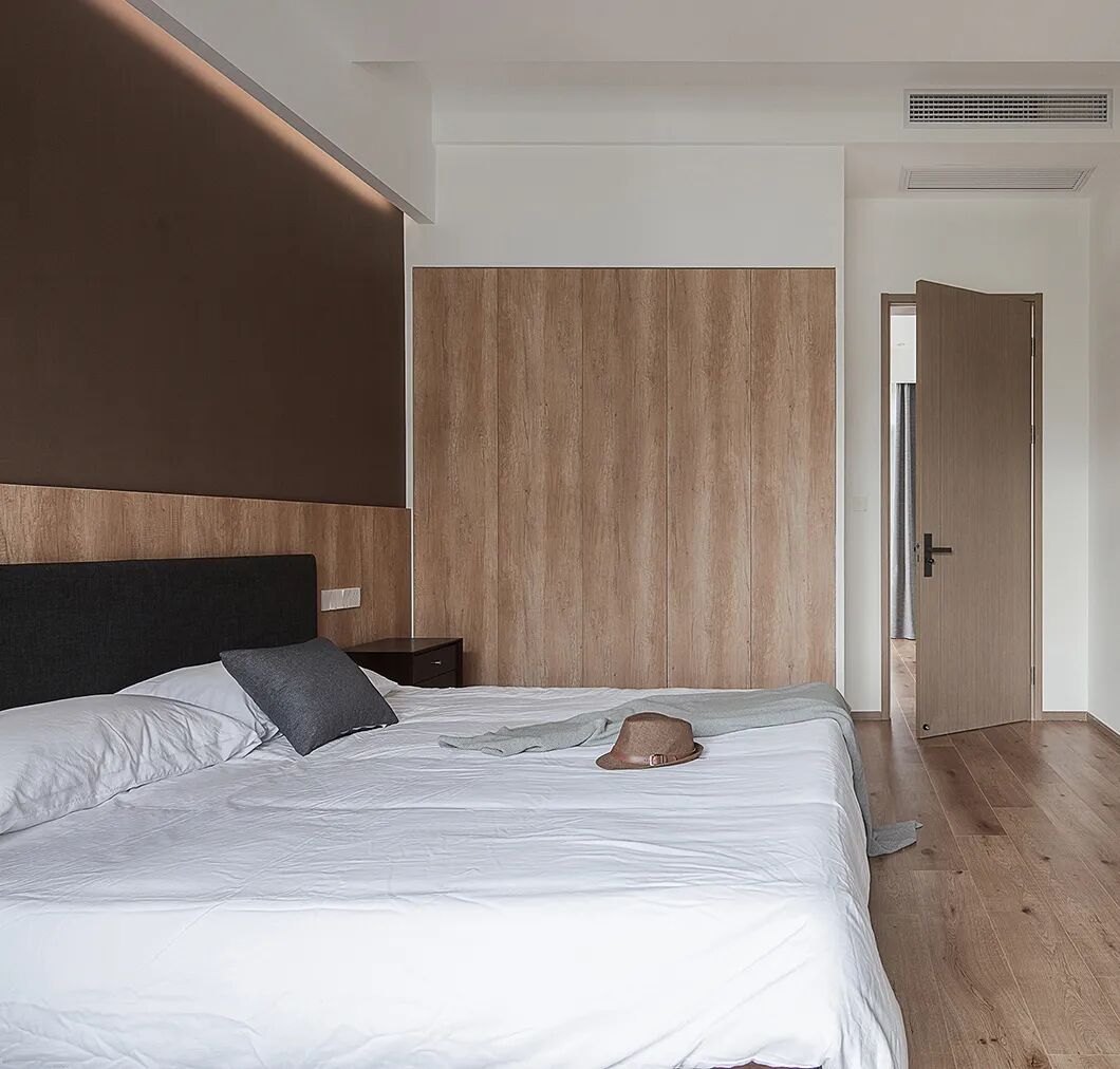 主卧延续整体空间氛围,以原木色和白为主调,原木地板配衬纯白色床品,营造悠然娴雅的氛围。静穆的艺术气质与细腻的感情于其中悄然生发,点亮居住者的精神世界。