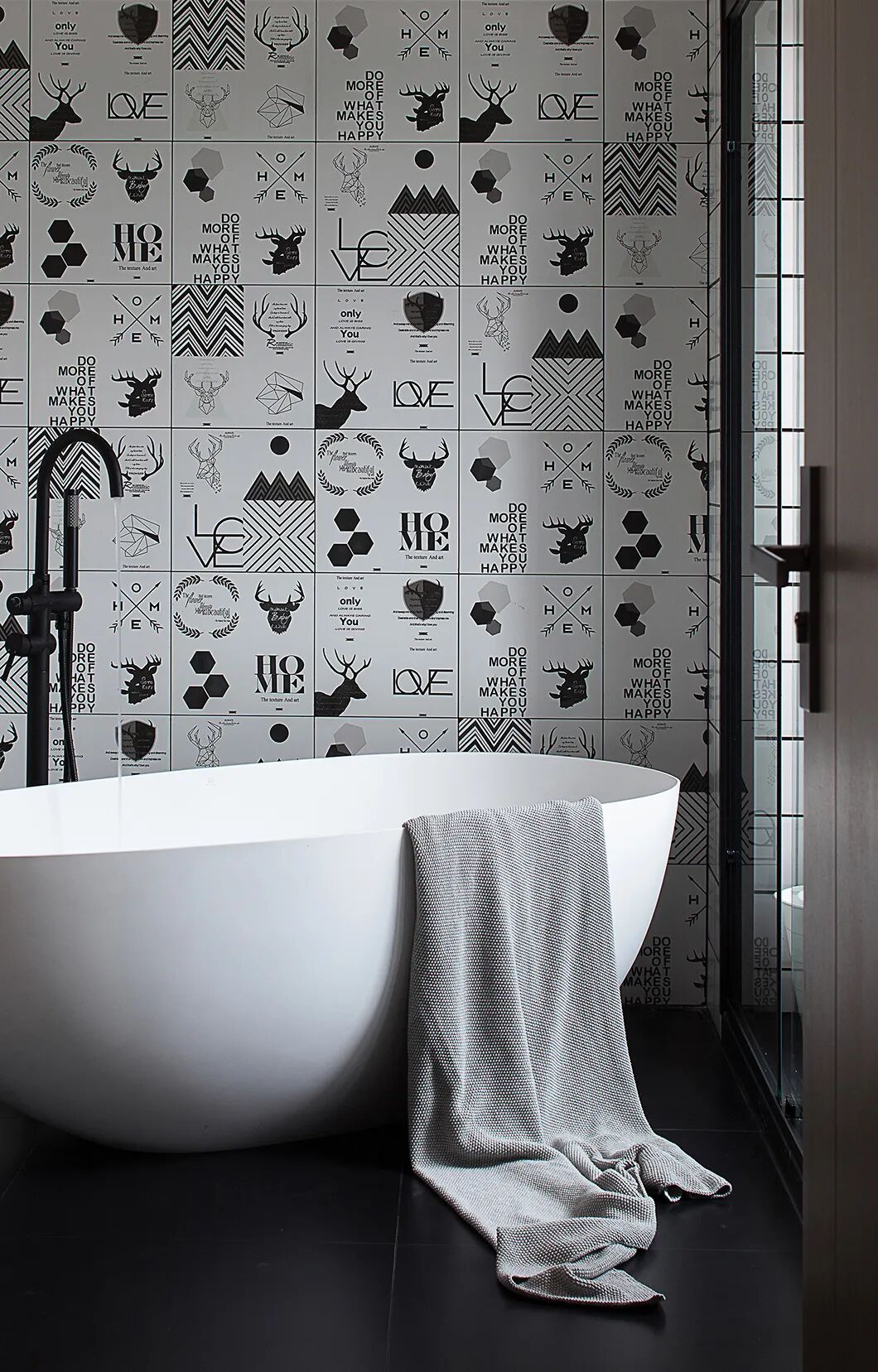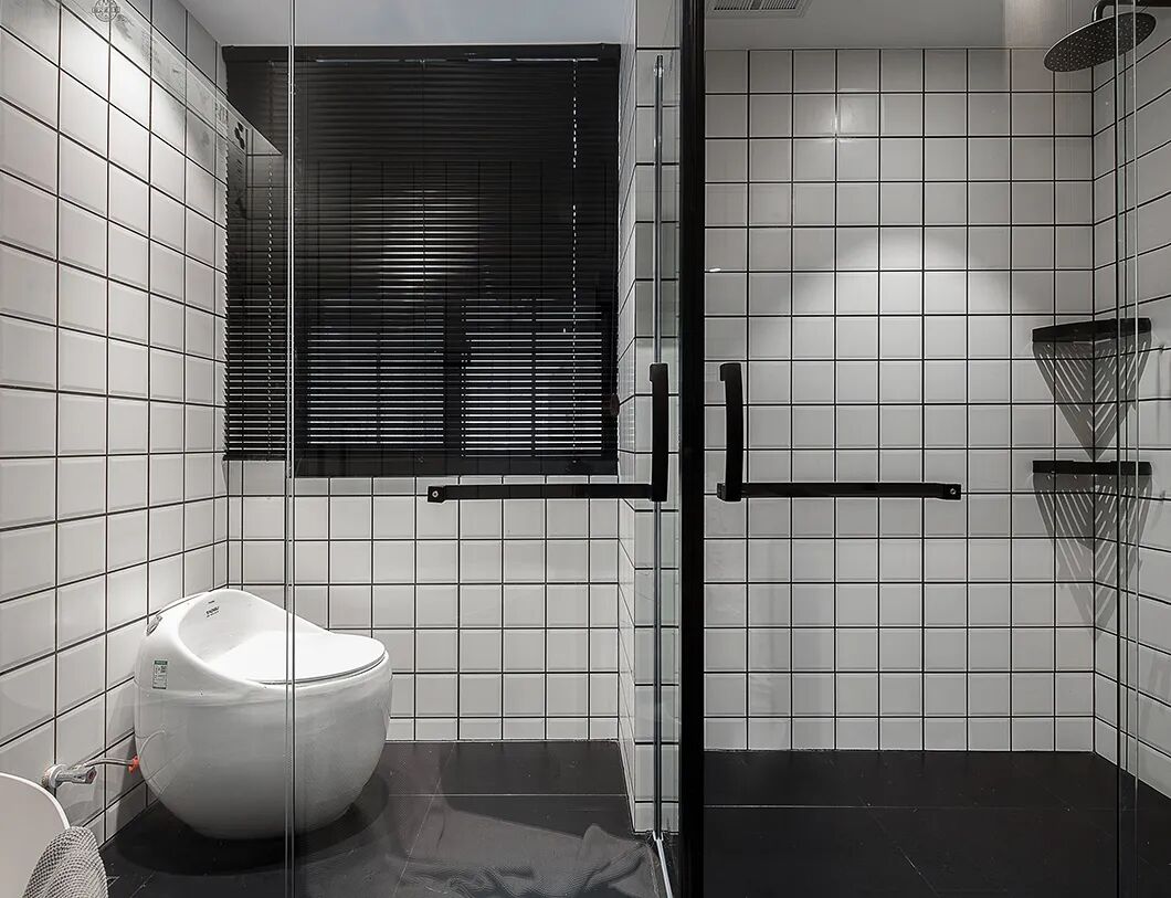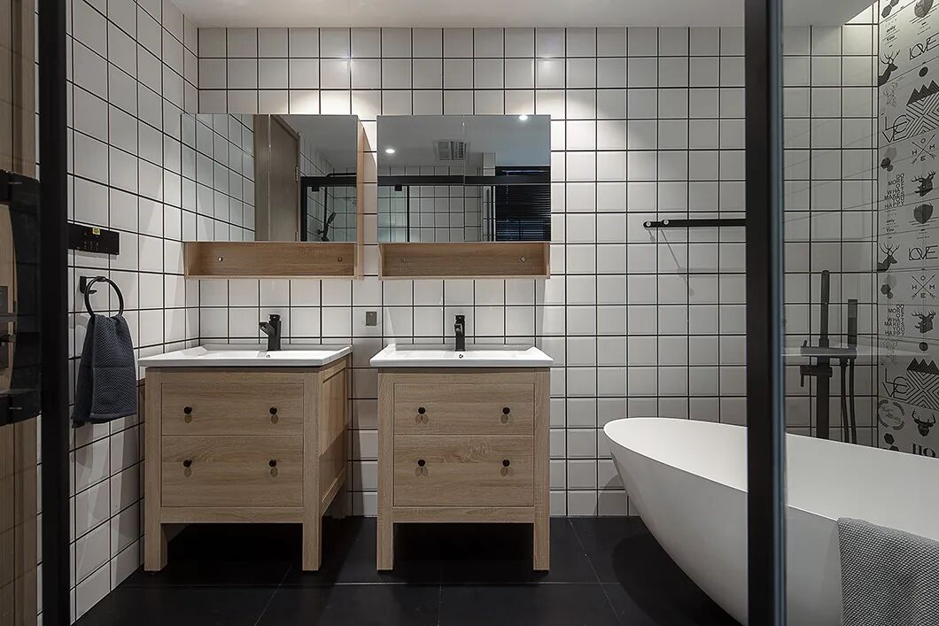 双台盆、落地浴缸、独立淋浴间和独立马桶间,简洁、现代的空间因为有尺寸的加持获得了极大的舒适体验。