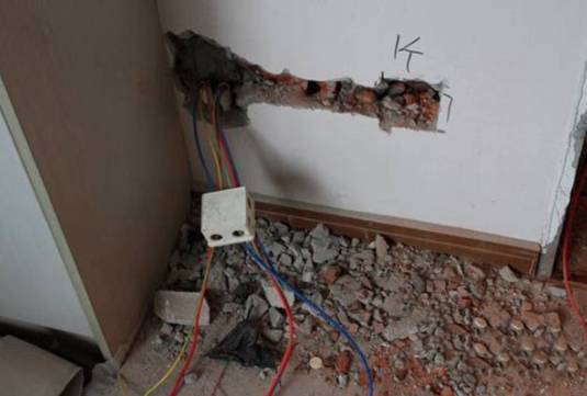现象:低价诱惑装修的公司或者游击队在开槽时野蛮施工,而且电线未套PVC管,存在严重的安全隐患。