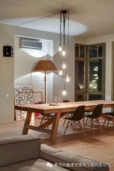 装修TIPS:细长型的餐桌,同样的简约风格。墙边着色杂乱的画框也为房间增添了不少艺术的气息