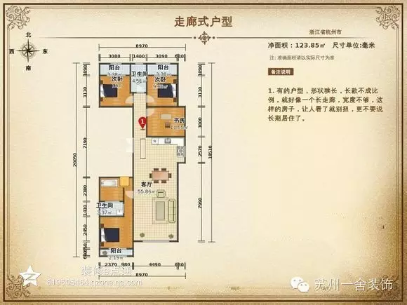 点评:这种户型存在采光问题,中间走廊部分很难采到光,另外走廊也无法利用,只能浪费。
