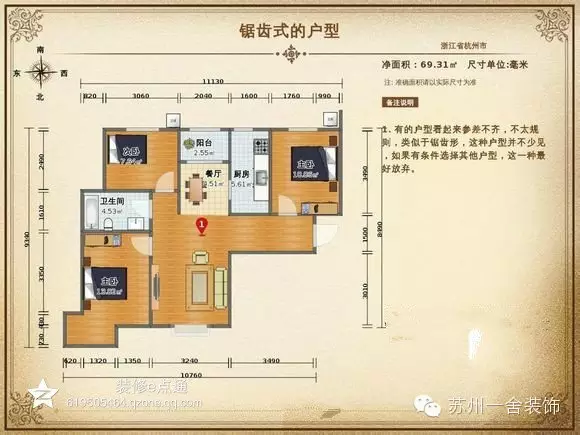 有的户型看起来参差不齐,不太规则,类似于锯齿形,这种户型并不少见,如果有条件选择其他户型,这一种最好放弃。