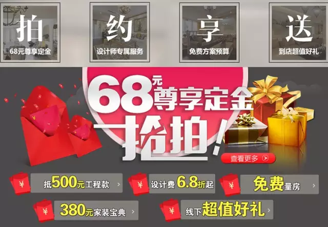线下门店无缝对接,天猫售后全程担保,你敢拍我敢送,订金68抵500工程款+6.8折设计费+ 免费量房+免费报价。