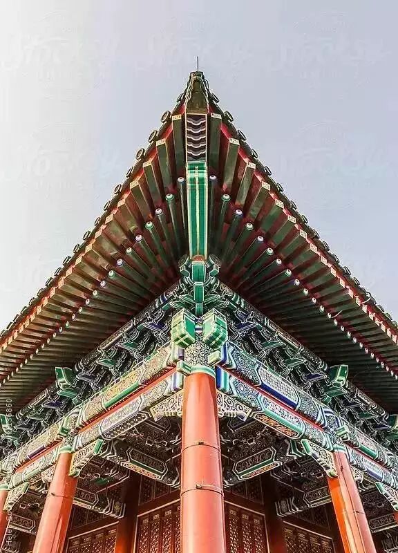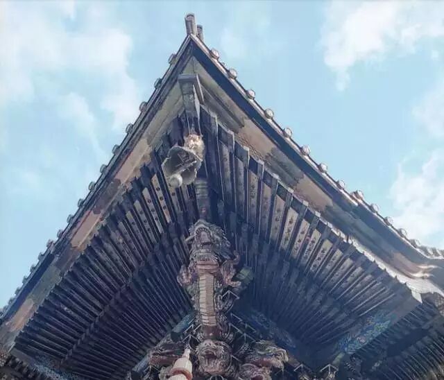 与西方的石制建筑不同,中国汉族木制建筑以斗拱为“基本词汇”,所谓斗拱,是将屋檐托起的交叠的曲木,它可以将纵向的力量向横向拓展,从而构造出多种多样的飞檐。