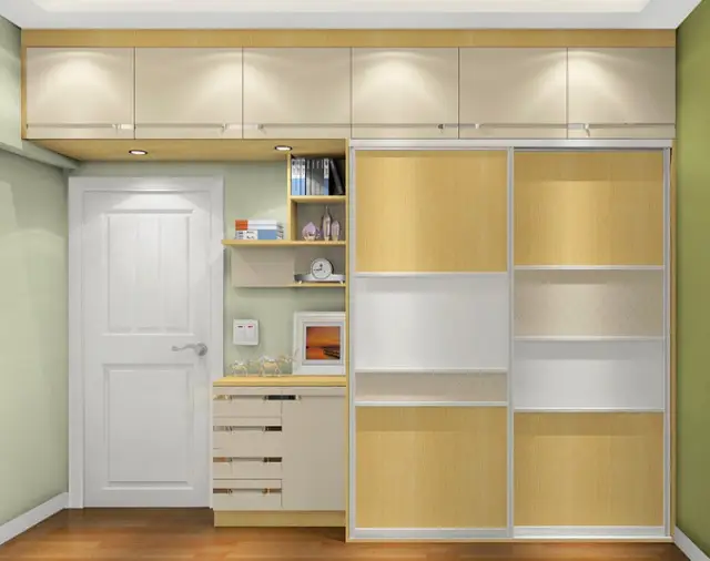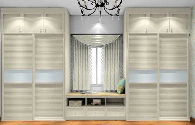 有的装饰公司为了做到墙体的整体性,常采用上柜做一裁吊顶,踢脚线的设计也比这个高一些,让整个柜子的高度控制在2400mm以内。这样做可以使衣柜达到一壁整体的柜门,而不是分成二段,但这样高的柜门,一般家庭自己做是不行的,要在外面订做门板,也一定要订做有合金外框架的柜门,才能保证不变形,当然价格就要贵很多了。