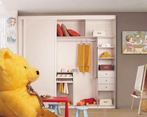 儿童的衣物,通常是挂件较少,叠放的衣物较多,且考虑到儿童玩具的摆放问题,最好能在衣柜设计时就考虑一个大的通体柜,只有上层的挂件,下层空置,可方便儿童随时打开柜门取放和收藏玩具,满足儿童好玩的心态。