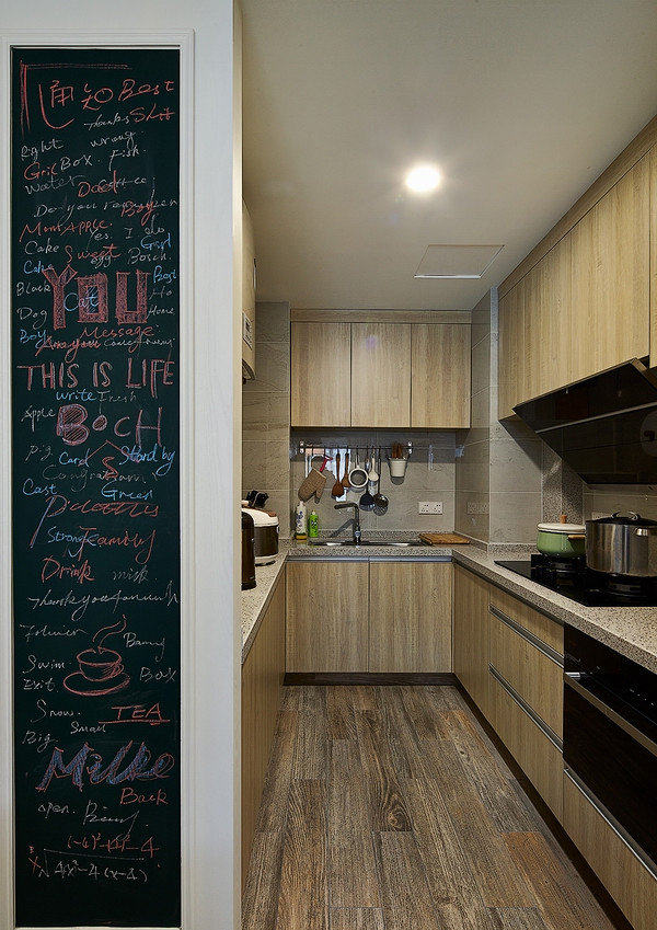 黑板漆的收边个人认为很灵的,像幅画一样,符合偶滴期待~当时这块黑板漆的颜色也是经过讨论的,还是感觉这样的墨绿色最好看。 厨房也没有隔开,这样的格局是打掉一部分墙实现的,餐厅跟厨房会变得宽敞。