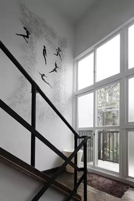 台阶处的白色墙壁上,印着舞动的少女,以及灰色的花纹,充满艺术气息。黑色的金属扶手,木质的楼梯,给人沉稳安静之感。