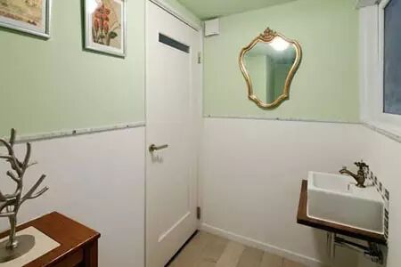 卫生间淡绿色和白色相搭配的空间,给人清新自然之感。正方形的洗手台,搭配金属复古水龙头,小巧别致。金色边框的洗漱镜,欧式宫廷风格浓厚。