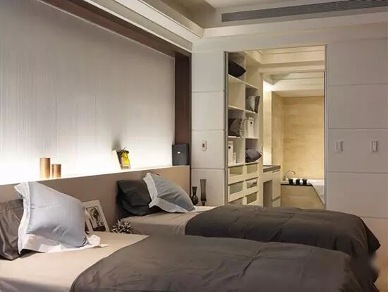 两张床的床头由延伸的墙面相连接,实现了空间的整体性和流畅性。卧室另一侧的隔间里,则是卫浴与收纳的结合空间。