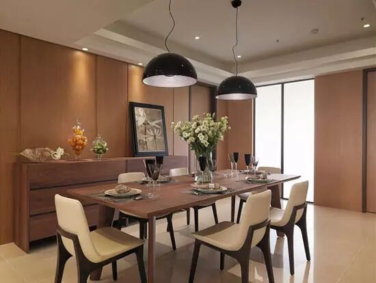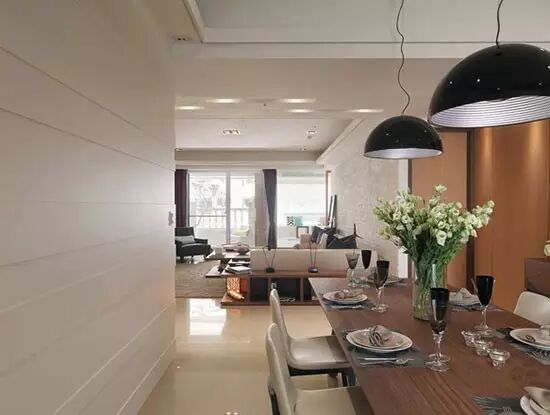 延伸至餐厅的地砖让空间更具整体性和关联性,木质长条形餐桌、白色简约餐椅与黑色半球状吊灯,实现了空间色彩的基础搭配。