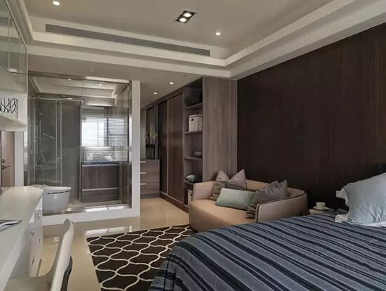 主卧室,以由浅至深的色彩过渡形成雅致而沉稳的睡眠氛围,深色床头背景墙让空间气质更显深邃,带有几何纹理的地毯为空间增添更为丰富的装饰元素。卧室里的卫浴间采用了透明玻璃作为隔断,颇具生活情趣。