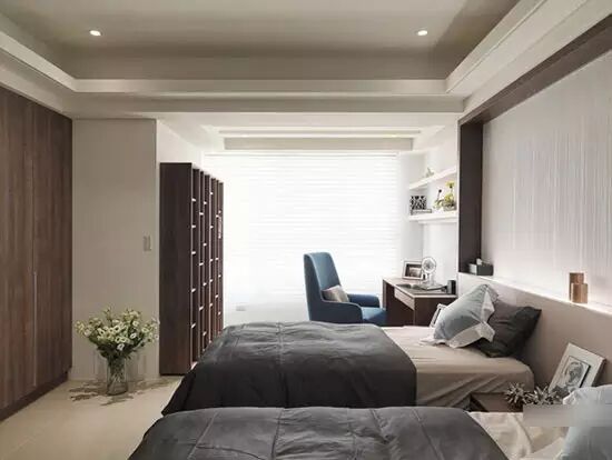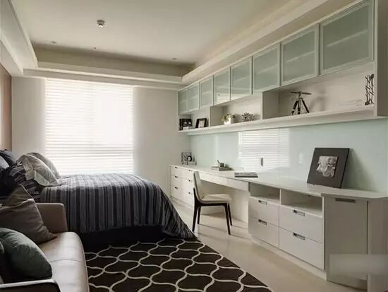 白色的长排书桌与吊柜,让卧室兼有了书房的功能,更多收纳空间带来的是更为方便实用的生活体验。