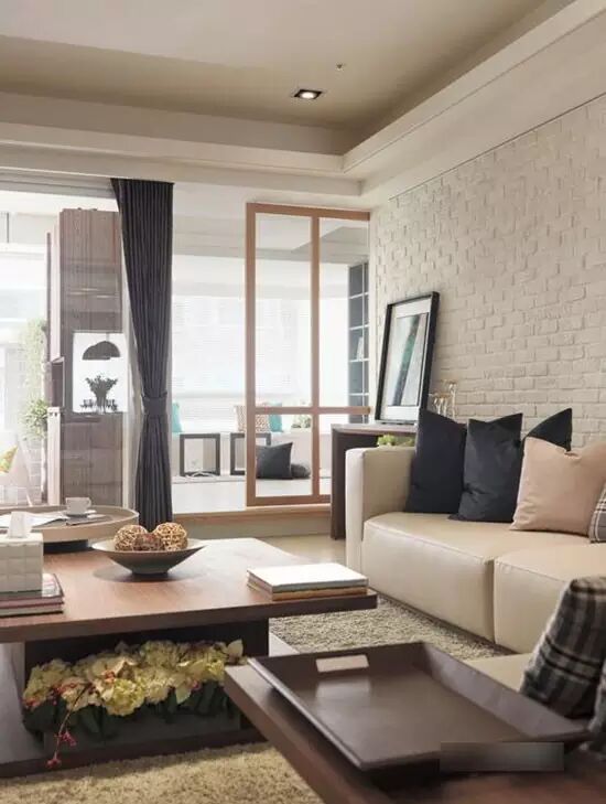 客厅连接着阳台和一间居室,木质门框与玻璃面板构成了隔断门,保证了视觉上的通透与视线的延伸,更有利于光线在空间中的流动与折射。