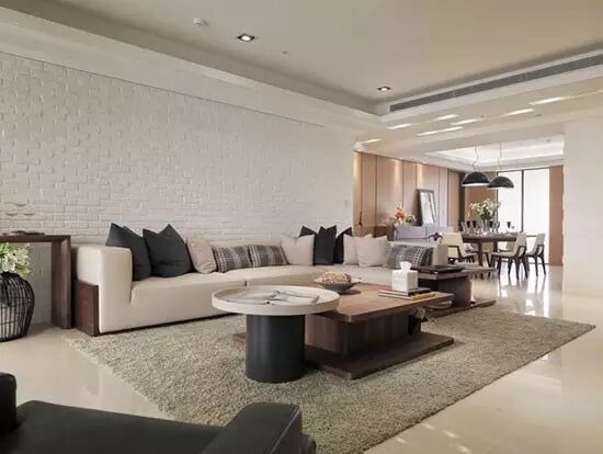 一进入客厅,就会立刻被眼前的画面所吸引。白色裸砖沙发背景墙与抛光亮面地砖形成光感上的对比,由阳台引入的自然光在地面上投射出的倒影在空间中形成了视觉扩容,原本就十分宽敞的客厅显得更加风度翩翩。保定乐上名都装饰