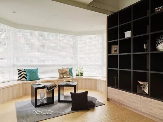 与客厅相连的居室则以休闲为主题,地面上铺贴了舒适的木地板,黑色的收纳架用来作藏品展示,不规则的飘窗在带来充足采光的同时也为生活增添了更多情趣。