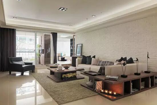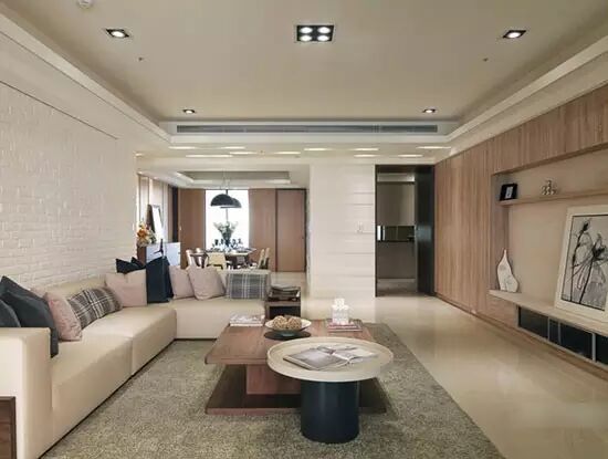 吊顶上的分散光源为空间提供立体而有层次感的照明,在与地面的相互映射下突出了空间光感。光洁的地面上,一块柔软的地毯带来更加暖热的温度。白色的沙发搭配原木色的边柜和茶几,自然温和的北欧风格已经初见端倪。