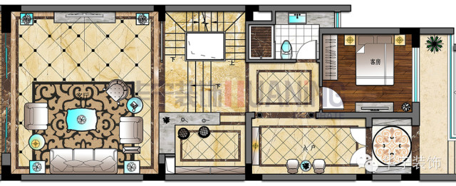 客厅顶面吊顶气势恢弘、电视背景采用大理三石雕花、全屋墙面贴砖、地砖采取分隔式铺贴水刀加工小砖点缀最大化的扩展了地面的延伸感,使整个空间连为一体,客厅中央巨型水晶吊灯晶莹剔透是整个空间的点睛之笔。