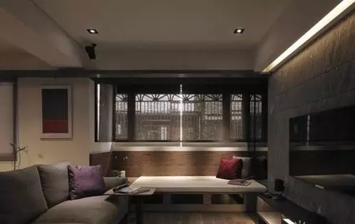 客厅-俐落的电视主墙,收纳机能补充于大跨距的窗下卧榻,与L型灰色布质沙发围塑出完整的客厅段落。