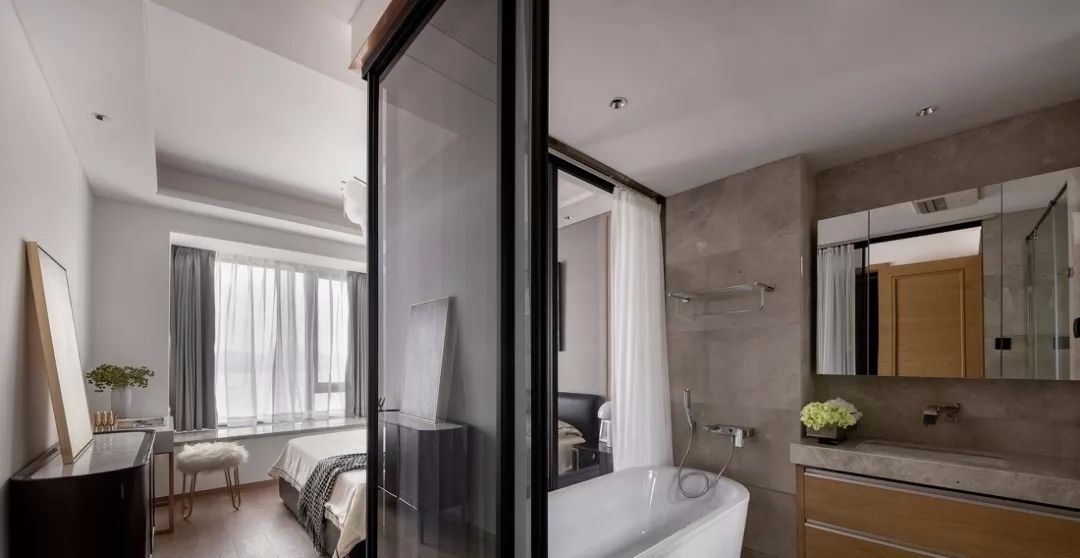 如果不愿意做成中规中矩的淋浴房,又想实现干湿分离,最方便的办法就是加装淋浴帘子。淋浴区一定要安装挡水条。