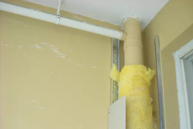 豪庭下水管采用静音包管工艺,外部用轻钢龙骨包裹。如果静音棉的填充量不够,静音效果就会大打折扣。工人师傅给管子包上了厚厚的静音棉,整整粗了一圈,效果自然不会差。