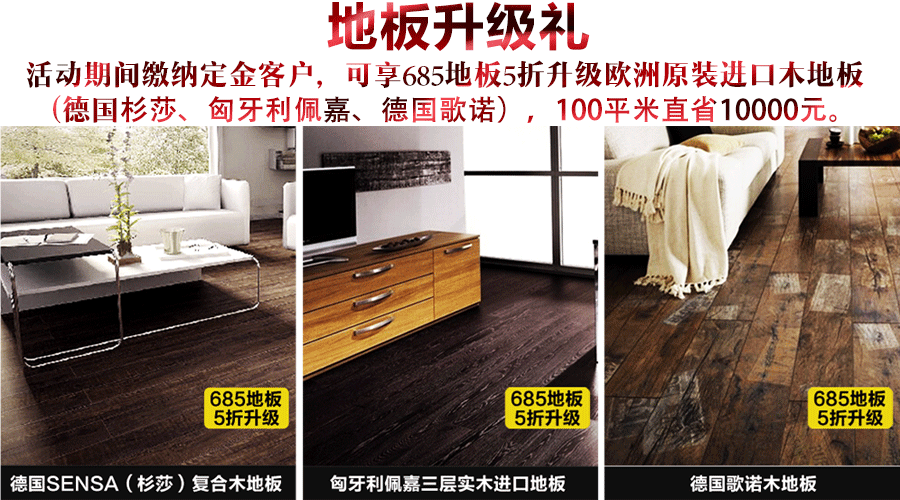 活动期间缴纳定金的客户,可享685地板5折升级欧洲原装进口木地板(德国杉莎、匈牙利佩嘉、德国歌诺),100平米直省10000元。