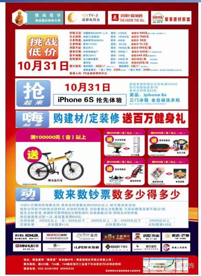 10月31日晨明爱家联盟国际建材开业大典啦,国际名模倾情助阵,成都电视台、成都电视台首席建材装修大师现场挑战装饰建材低价极限,抢iPhone,购建材定装修送百万健身礼,都来数钞票,数多少得多少。入围品牌:科勒卫浴,方太橱柜、电器,王者陶瓷,鸿墅木门楼梯,德洛巴顿衣柜,爱沙迪克墙布墙纸,联丰地板,民辉窗帘、软装,成都春满人间装饰