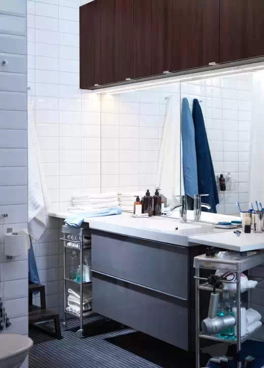 布局合理的卫生间应当有干湿之分。湿区不适宜储物,即使是干燥区,卫生纸、毛巾、浴巾等如果长期放置,也一定要用防潮的储物箱存放,避免受潮。