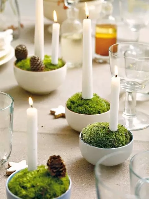 令人眼花缭乱的青苔装饰很容易,把它们放到碗里或烛台,或者利用青苔装饰垂直墙很不错。