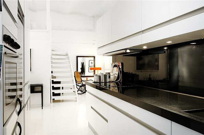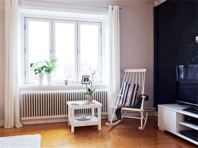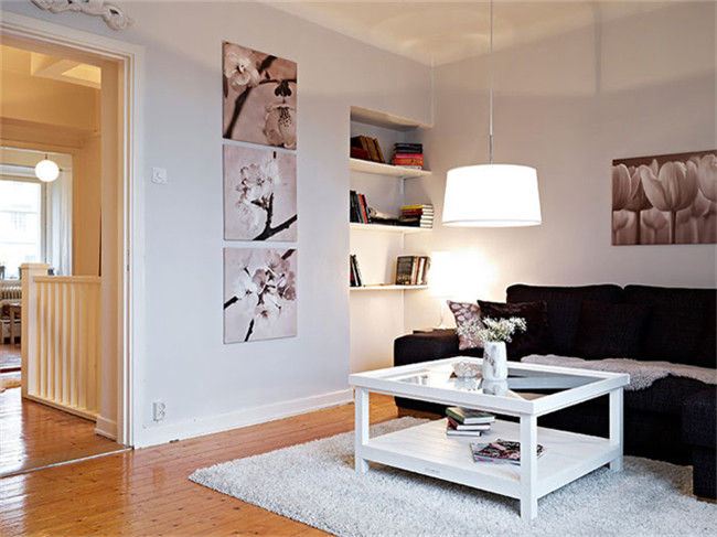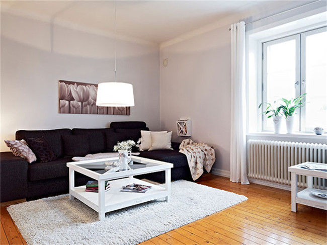 墨黑色沙发搭配白色茶几白色地毯和浅黄色地板条纹,极简的装扮风格透露出主人对生活的追求,宁简不繁越来越被更多的人所推崇深圳南山装修公司