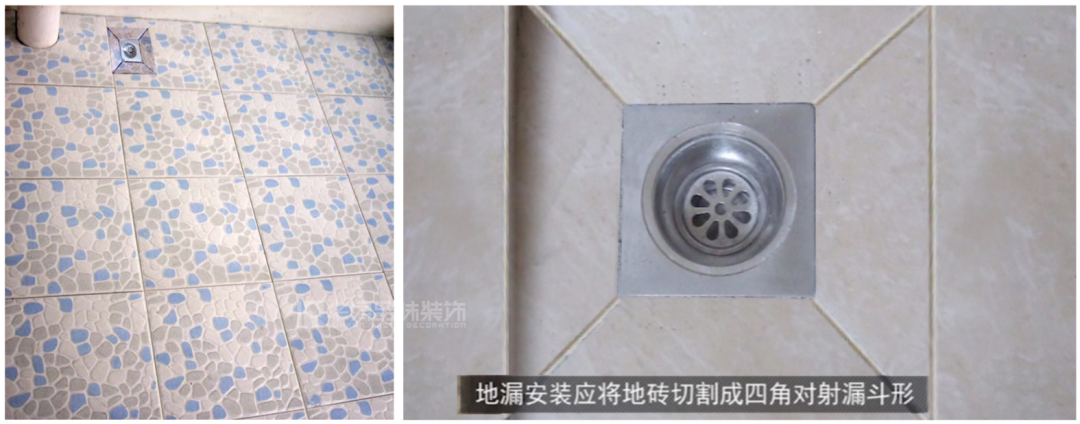地漏口的铺贴应切成四角呈放射状,回字形水槽,