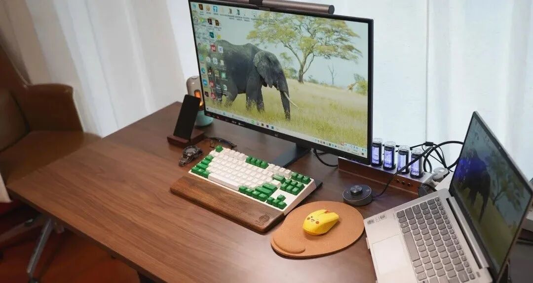 如果家里已经有书桌,可以加放一个小型的台面升降桌,满足功能的同时也是一种更具性价比的做法。