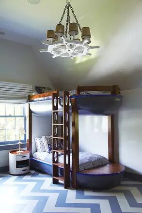谁能不爱这对创造性的航海卧室船?双层床、带有军人特色的地板上,尤其是吊灯。