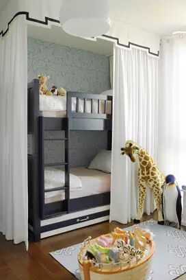 在双层床边上,安装一个窗帘,不仅增加了时尚感,还有功能性。蓝色的调色板是一个宁静的环境。