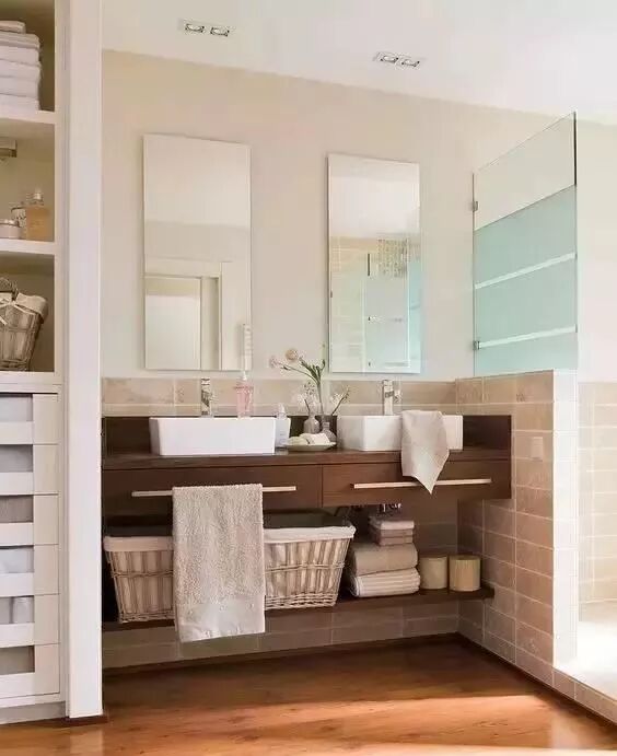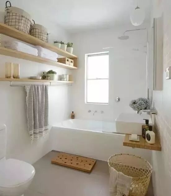 充分利用墙壁,也是不错的方法,多设一些置物架,方便放置东西。但不建议墙壁装吊柜哦,毕竟卫生间比较潮湿,而吊柜多是木质材料,时间久了也会发霉掉皮等,使用寿命不长。