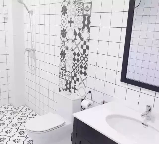 这款卫生间就是在地面,以及马桶后侧铺设了不同图案的花砖,整个浅色调的空间,效果立马就不一样了。