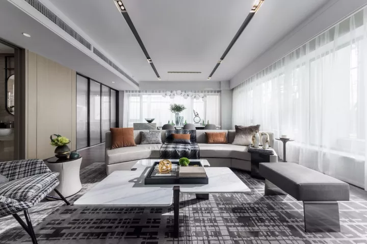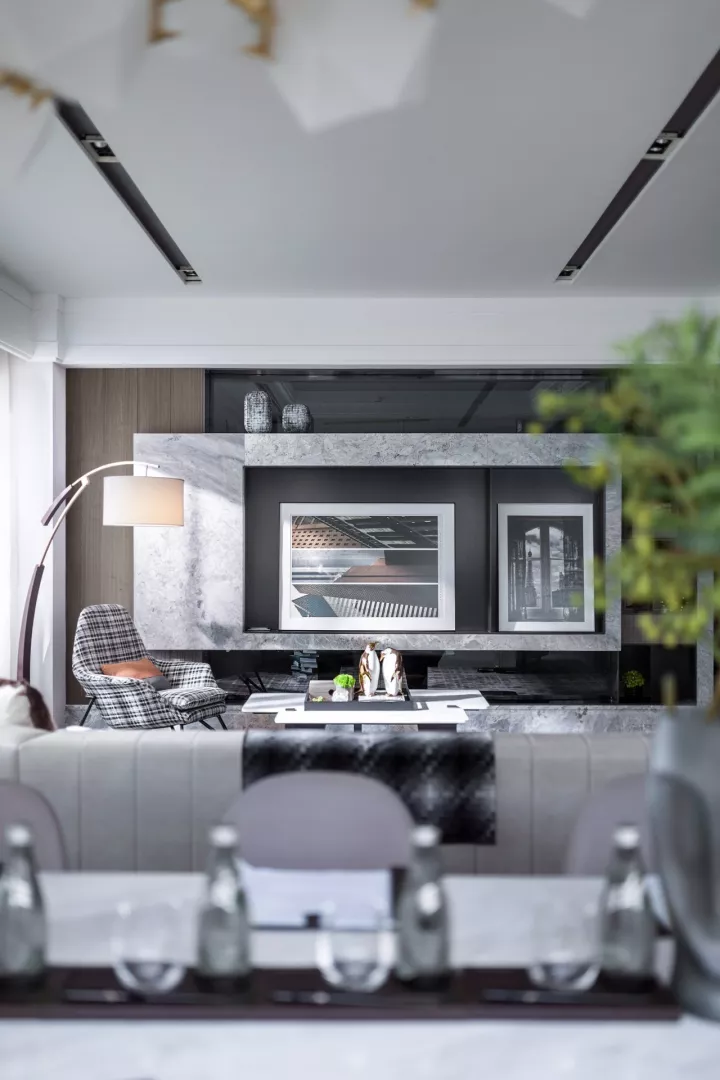 设计师用现代简约设计手法来铺陈空间,大面的落地窗拥有极佳的视野,黑白灰色调的运用赋予了空间独特的雅韵和品质感。经典的格纹透露出些许英伦情调。