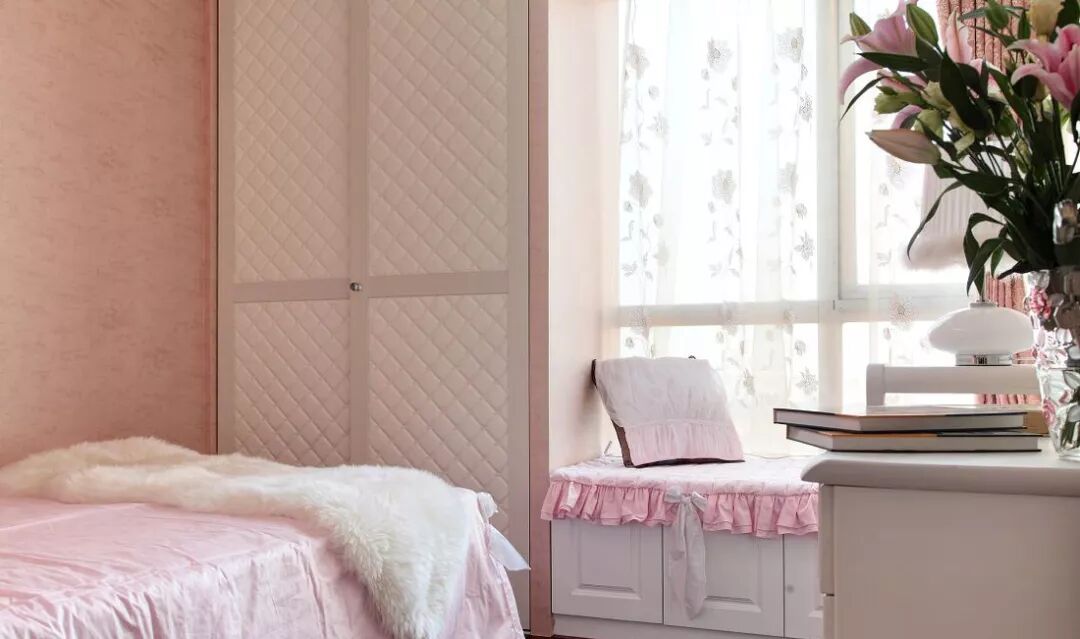 儿童房也是选择了浪漫的粉红色作为主体,飘窗坐垫、床品和壁纸背景墙,再加上奶白色的衣柜门,都让人少女心满满。
