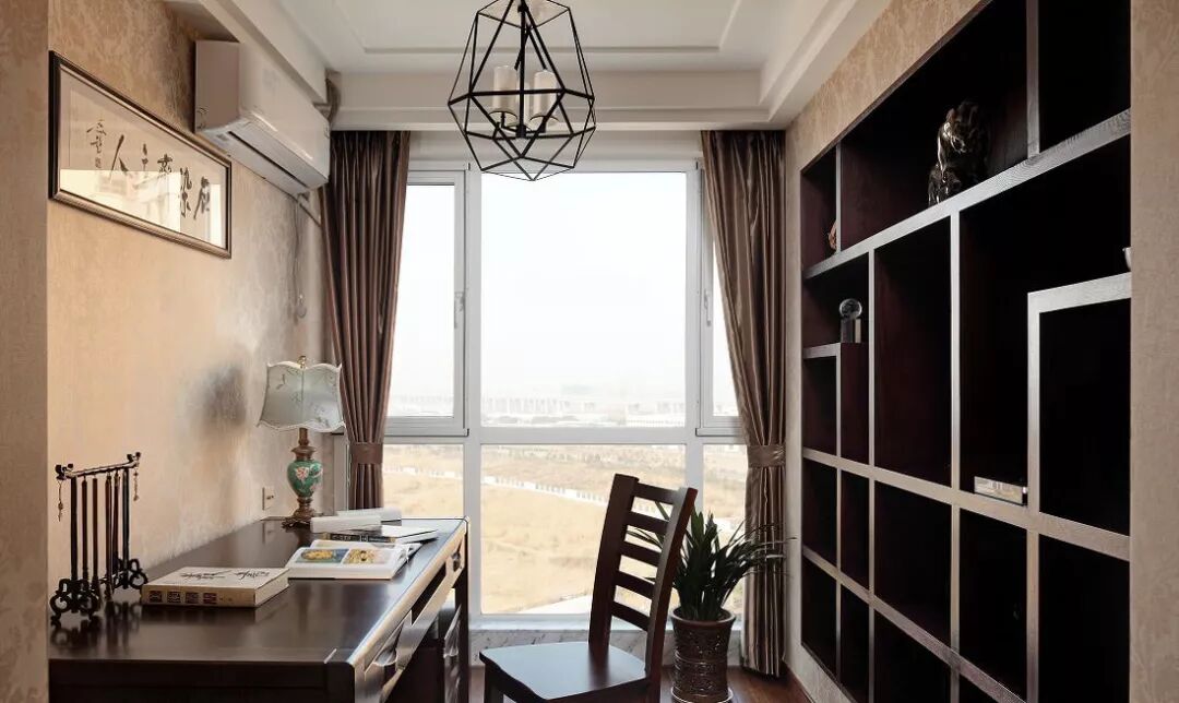 书房大概是最能体现中式风的地方,设计师也用深沉木色的书桌椅和书架作为主体,搭配一些小摆设,来展现中式风中独特的古香古色、历史韵味。